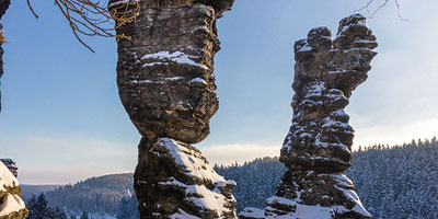 Nochmals nehmen wir ein romantisches Ziel in den Blick: zwei schlanke, pittoreske Felstürme im hinteren Bielatal, die dank ihrer fragilen Gestalt mit Überhängen als Naturwunder gelten. Ihre Namen – Große Herkulessäule und Kleine Herkulessäule – verdanken sie dem Privatgelehrten und Heimatforscher Carl Merkel.